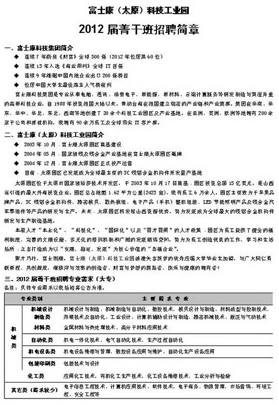 附:富士康(太原)科技工业园2012届菁干班招聘简章